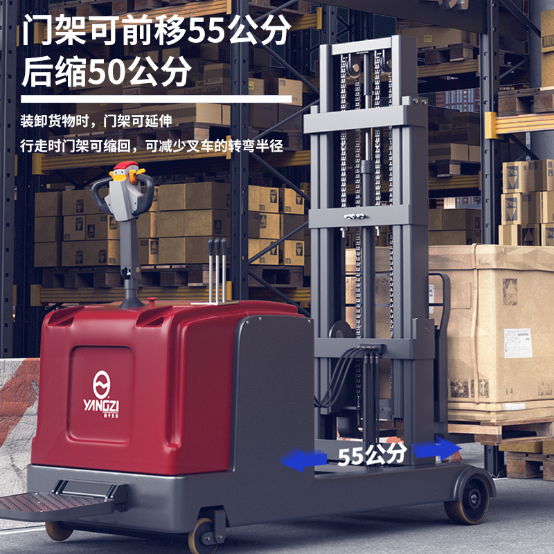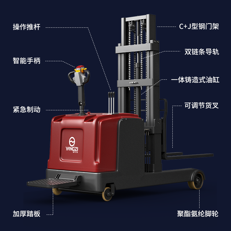 揚(yáng)子推高車(chē) CQD-J:不用條托盤(pán)的前移式電動(dòng)堆高車(chē),增強(qiáng)載重,通過(guò)性強(qiáng),貨叉前段可緊貼地面方便叉取貨叉,而且門(mén)架后仰時(shí)貨物穩(wěn)定不易滑落,使用更安全放心。