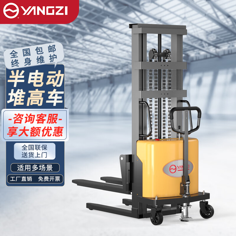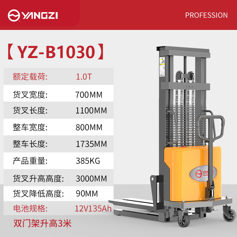 揚(yáng)子半電動(dòng)升降堆高叉車YZ-B1030載重1噸升高3米,電動(dòng)液壓升降/加厚C型貨叉/根據(jù)工況定制